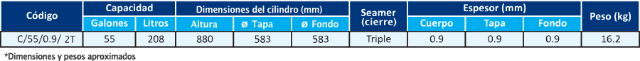 El cuerpo es cilíndrico y está soldado eléctricamente. Lleva un sistema de corrugado con aros hundidos que le da resistencia y optimiza su espacio de almacenaje y transporte. La tapa y el fondo están unidos a este mediante un “triple seamer” (triple cierre) que lleva en su interior un compuesto sellador (apto para ser utilizado en envases para alimentos) garantizando de esta manera la hermeticidad del envase. La tapa tiene 2 tapones ( de 2″ y 3/4″) reforzados con empaquetadura de teflón grado alimentario.