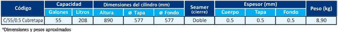 El cuerpo es cilíndrico y está soldado eléctricamente. La tapa y el fondo se unen al cuerpo  mediante un cierre al cual se le aplica internamente un compuesto sellador garantizando su hermeticidad. Los cilindros son usados para contener asfalto sólido, para lo cual cuenta con un agujero en la tapa que facilita el llenado del producto. Una vez lleno, el agujero se cierra mediante una cubretapa que encaja  a presión. Están fabricados con acero de 0.5 mm  para facilitar el retiro del asfalto al enfriar. Además, cuentan con un sistema de corrugado en el cuerpo para dar consistencia al envase.