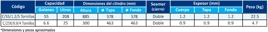 Los cilindros están fabricados con acero laminado en frio de primera calidad según normas internacionales, con espesores de plancha de 1.2 mm y 0.9 mm.