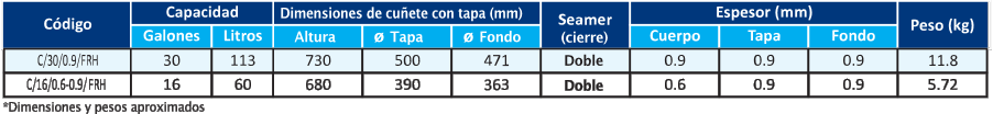 Abiertos: Su cuerpo es cilíndrico y están soldados eléctricamente. El fondo se une al cuerpo mediante un cierre que contiene en su interior un compuesto sellador garantizando de esta manera la hermeticidad del envase. Tienen una tapa totalmente removible (FRH) la cual se acopla al cuerpo mediante un anillo de 1.2 mm. que se asegura con un sistema perno/tuerca o cierre de palanca (clamp).
